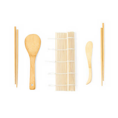 5-piece sushi set made of natural bamboo. Including 1 sushi mat, 2 sets of chopsticks, a spoon and a knife/paddle for rice. Supplied with cotton bag for portability and easy storage. Presented in an individual eco-design box in kraft cardboard.5 Pieces. Cotton Pouch IncludedBamboo