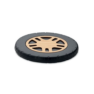 15W wireless charger crafted from recycled ABS with a bamboo top, featuring a car tire design. Simply connect the charger to your computer, place your smartphone on it, and enjoy quick charging with an output of DC 9V/1.10A (15W). Compatible with all QI-enabled devices, including the latest Androids and iPhone models from the iPhone 8 and X onwards.