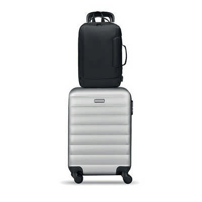 Computer backpack in 300D RPET Polyester with padded shoulder strap including one main internal compartment for 16 inch laptop and a USB charging cable.