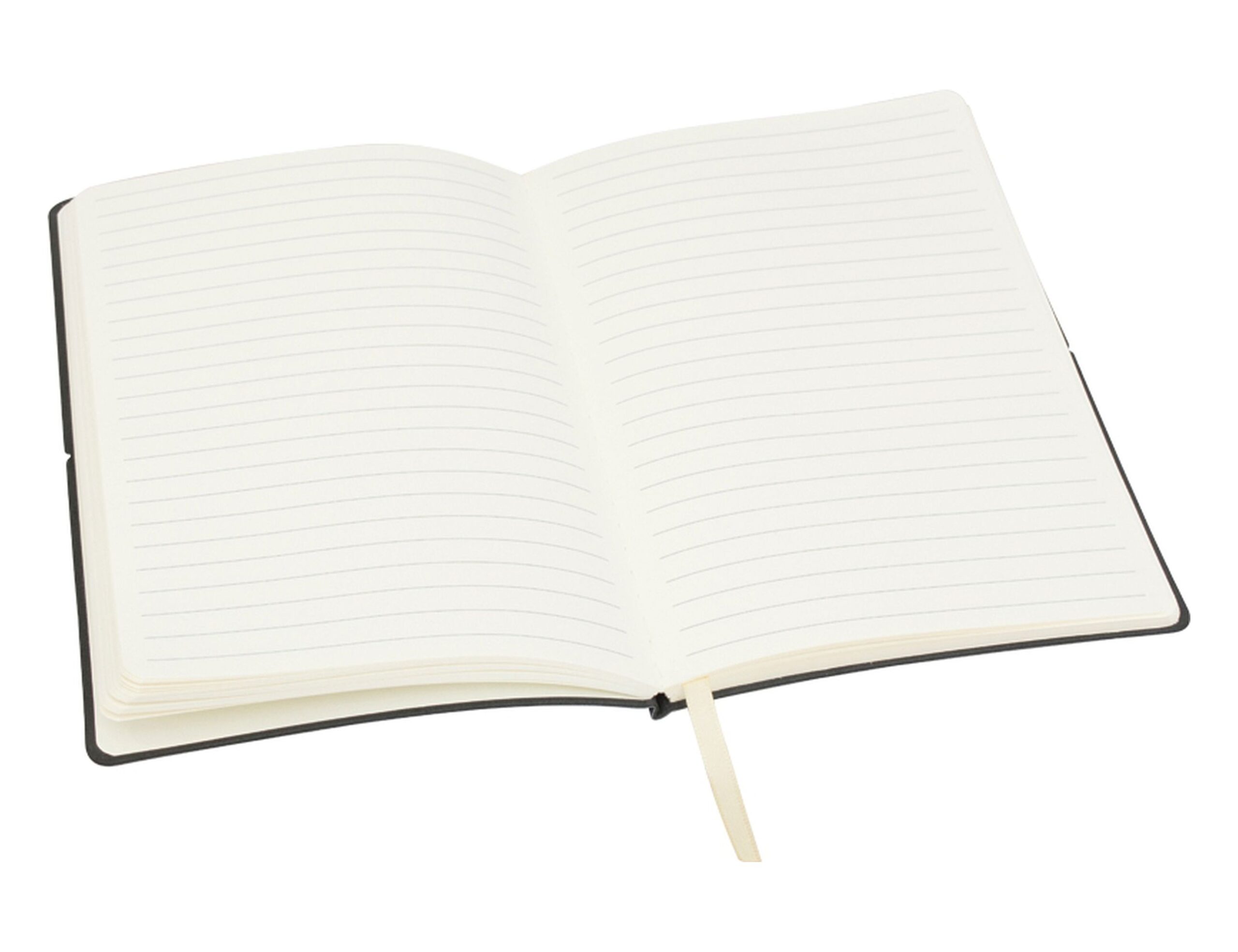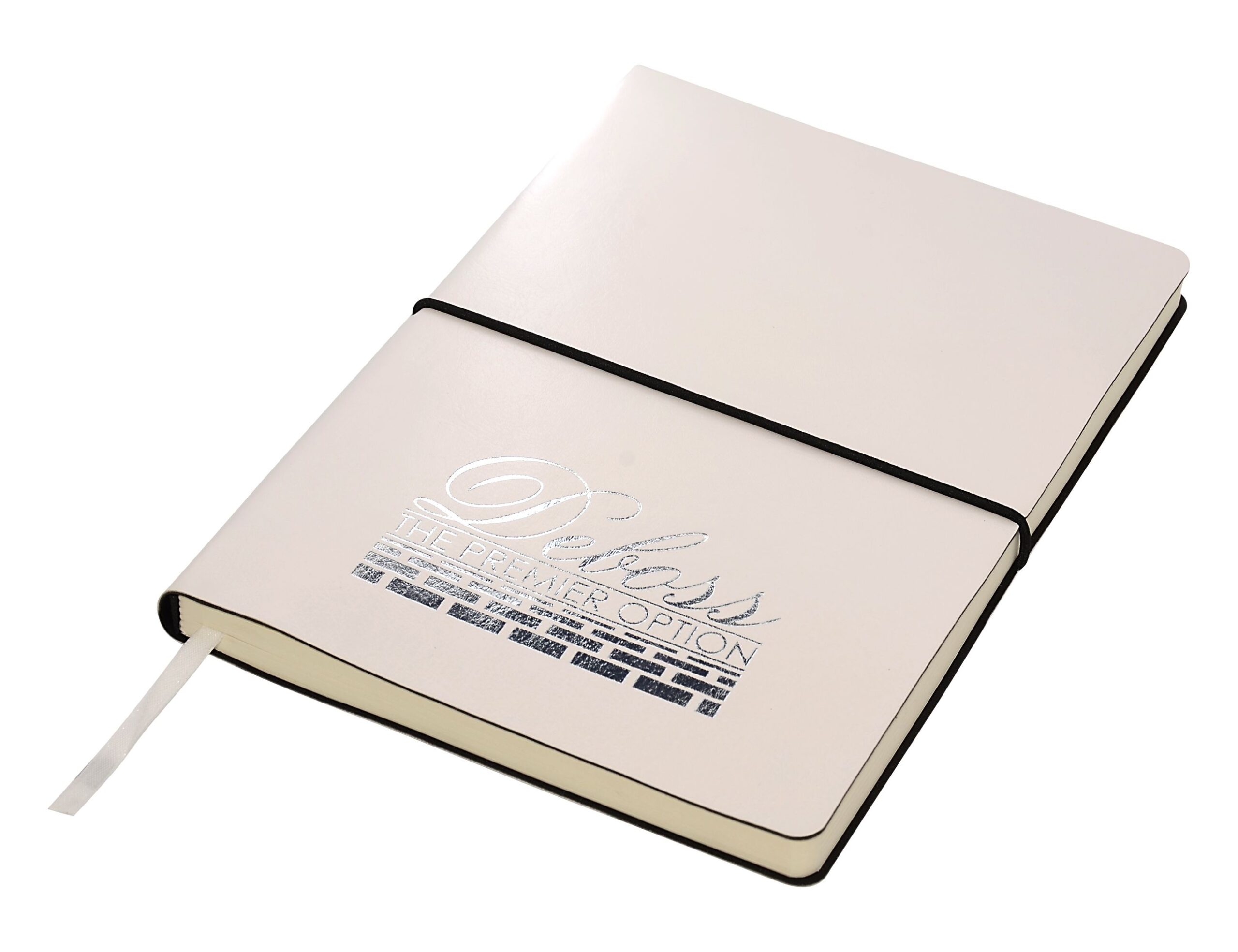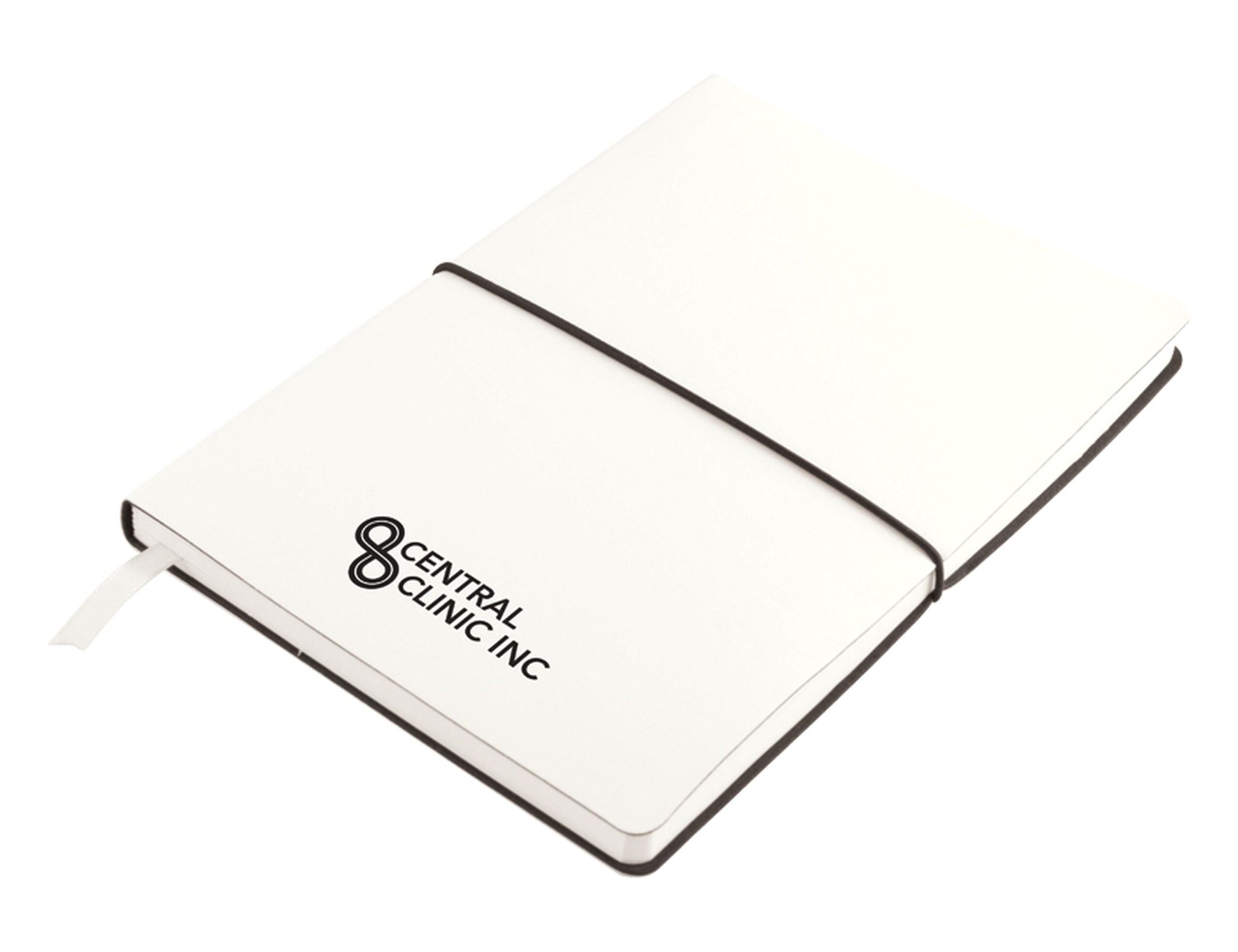 This quality A5 notepad features a soft leather-feel cover, elastic closure, ribbon marker and cream coloured lined pages. Available in black, navy and white, all with black elastic. If you’re after a debossed notebook, check these out!_x000D_n_x000D_nNotebook Gift Box is an optional extra – see W17_x000D_n_x000D_n